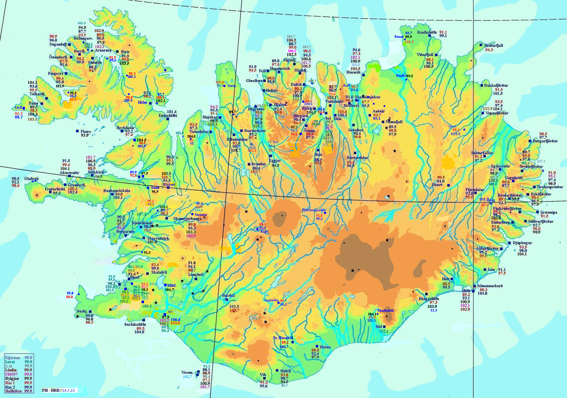 [breyta | breyta frumkóða]Útvarpsstöðvar þessar nást svo til á öllu Íslandi eða nást í fleiri en einu aðskildu byggðarlagi: